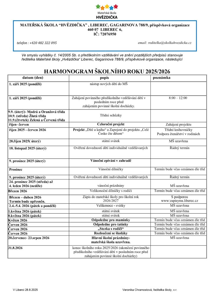 Ostatní děti se rozcházejí mezi 14.30 hod a 17.00hod. V případě, že rodiče potřebují výjimečně vyzvednout dítě v jiný čas, oznámí tuto skutečnost ráno při předávání dítěte do třídy.